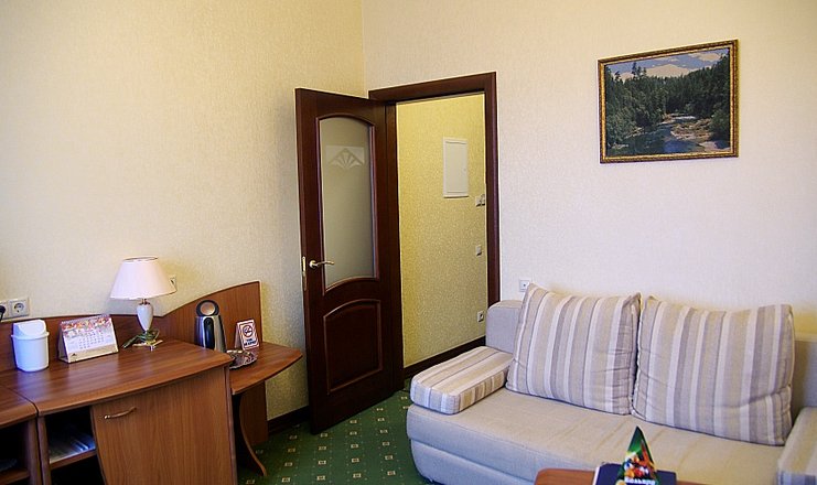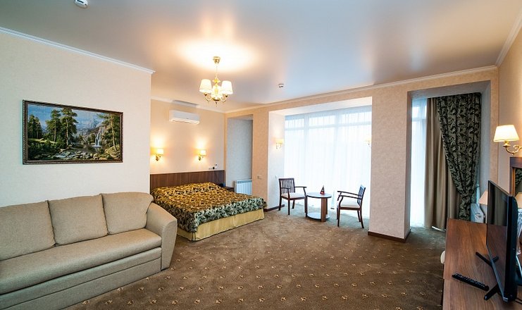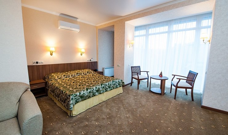 В номере: кровать двуспальная, стол, столик туалетный, стулья, гладильная доска, диван, набор посуды, сейф, сплит-система, телевизор, утюг, холодильник, электрочайник