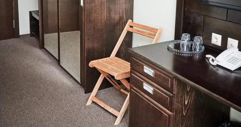 В номере: багажная тумба, зеркало, две полутораспальные кровати, тумбы, стулья, шкаф-купе, телевизор, светильник, электронные замки, Wi-Fi, телефон