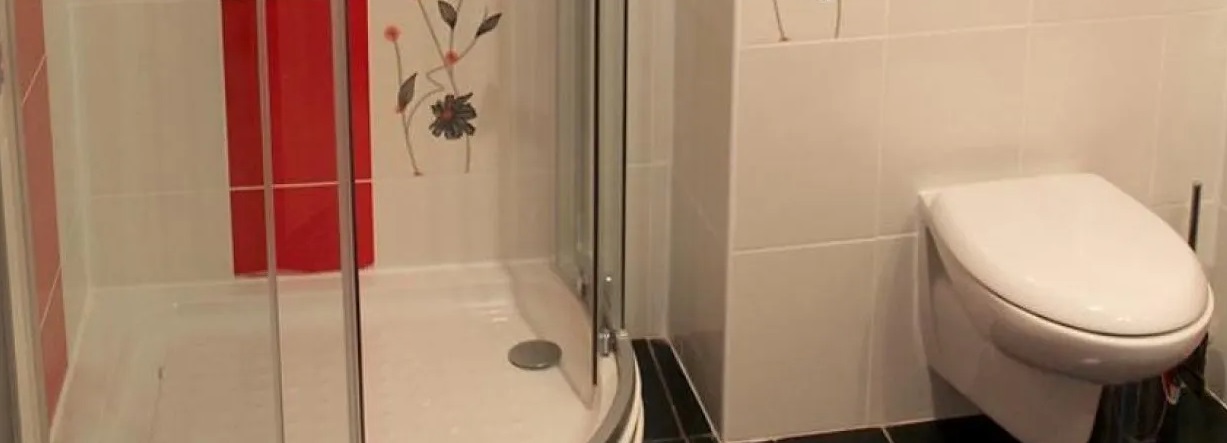 Санузел: душевая кабина, унитаз, раковина, гигиенические средства, банные полотенца, фен